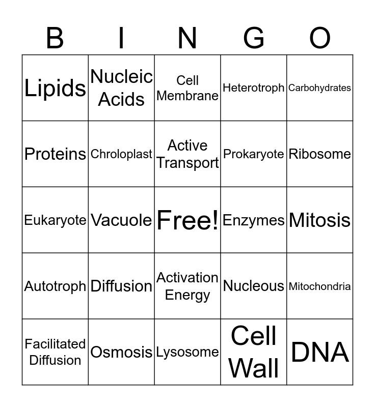 This bingo card has a free space and 24 words: Diffusion, Osmosis, Active Transport, Facilitated Diffusion, Carbohydrates, Lipids, Proteins, Nucleic Acids, Enzymes, Activation Energy, Prokaryote, Eukaryote, Nucleous, Mitochondria, Chroloplast, Cell Wall, Mitosis, Cell Membrane, Ribosome, Vacuole, DNA, Autotroph, Heterotroph and Lysosome.