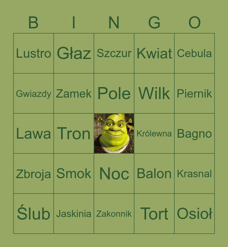 This bingo card has a free space and 24 words: Smok, Jaskinia, Pole, Ślub, Cebula, Lustro, Gwiazdy, Głaz, Królewna, Noc, Wilk, Lawa, Balon, Krasnal, Zamek, Tort, Bagno, Szczur, Piernik, Tron, Osioł, Zbroja, Kwiat and Zakonnik.