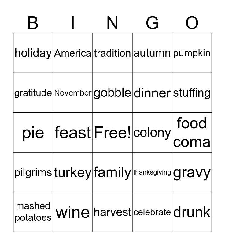This bingo card has a free space and 24 words: turkey, wine, gobble, mashed potatoes, pumpkin, holiday, gratitude, America, colony, family, dinner, pie, thanksgiving, gravy, November, celebrate, food coma, tradition, stuffing, feast, drunk, pilgrims, autumn and harvest.