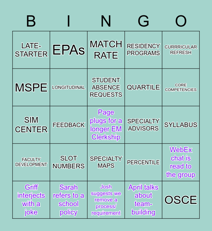 This bingo card has 45 words: LCME, Page plugs for a longer EM Clerkship, REMEDIATION, Griff interjects with a joke, Attendance issues are discussed, April talks about team-building, MATCH RATE, ORIENTATION, CURRRICULAR REFRESH, Sarah refers to a school policy, RESIDENCY PROGRAMS, SPECIALTY ADVISORS, SPECIALTY MAPS, SLOT NUMBERS, OASIS, Josh suggests we remove a process/ requirement, CPX, SIM CENTER, Christy requests fewer students, CORE COMPETENCIES, EPAs, LEARNING OBJECTIVES, GRADUATION, LATE-STARTER, HIGH-ACHIEVING, SYLLABUS, NBME SHELF EXAM, MID-YEAR CLERKSHIP REPORT, PERCENTILE, FACULTY DEVELOPMENT, STEP 1, WebEx chat is read to the group, Group is reminded to use the microphone, STEP 2, WebEx attendee unmutes to ask question, FEEDBACK, SUMMARY EVALUATION, DISTRIBUTION OF GRADES, OSCE, STUDENT ABSENCE REQUESTS, MSPE, QUARTILE, IT assistance is sought for running slides/AV/WebEx, LONGITUDINAL and OSAT.