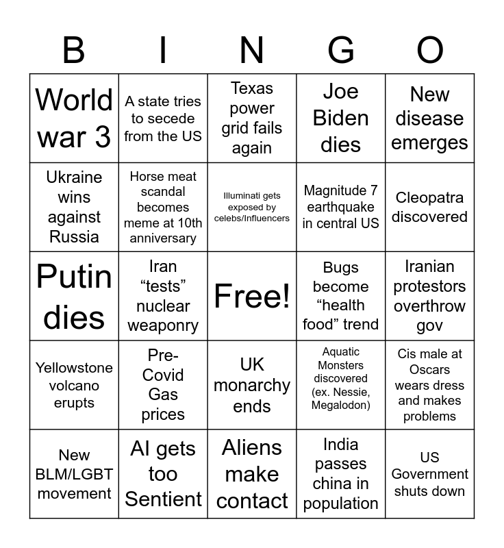 This bingo card has a free space and 24 words: Pre- Covid Gas prices, AI gets too Sentient, Illuminati gets exposed by celebs/Influencers, New BLM/LGBT movement, New disease emerges, World war 3, Ukraine wins against Russia, A state tries to secede from the US, Bugs become “health food” trend, UK monarchy ends, Magnitude 7 earthquake in central US, Putin dies, Aquatic Monsters discovered (ex. Nessie, Megalodon), Cis male at Oscars wears dress and makes problems, Horse meat scandal becomes meme at 10th anniversary, India passes china in population, Iranian protestors overthrow gov, Texas power grid fails again, Cleopatra discovered, Iran “tests” nuclear weaponry, US Government shuts down, Yellowstone volcano erupts, Joe Biden dies and Aliens make contact.