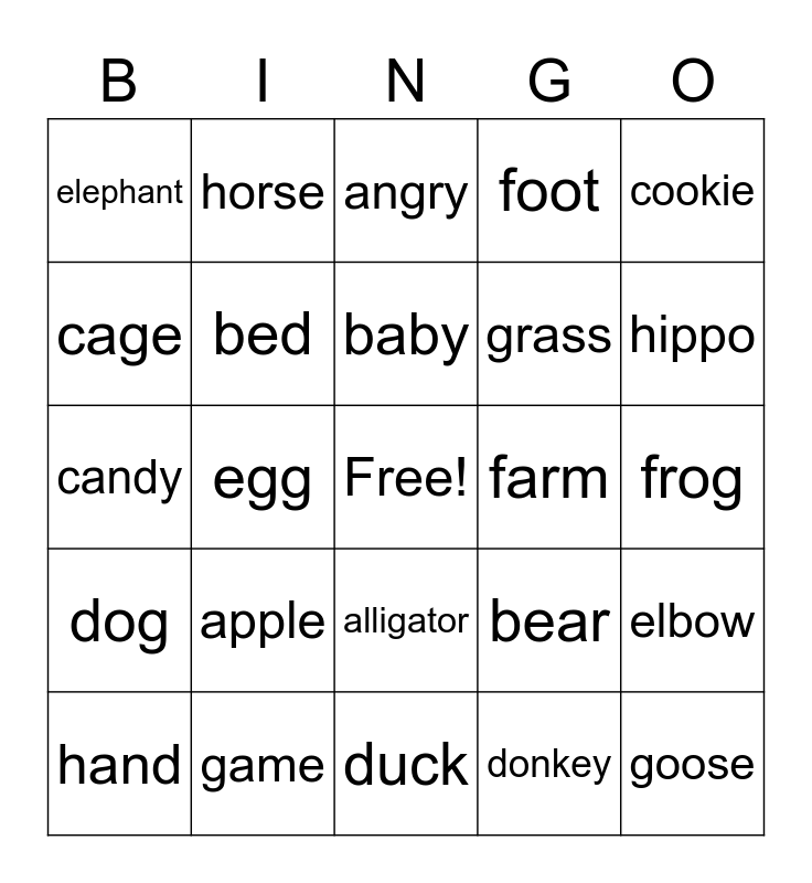This bingo card has a free space and 24 words: apple, game, baby, hand, cookie, elephant, cage, horse, farm, alligator, grass, candy, bear, elbow, bed, donkey, frog, angry, hippo, egg, goose, dog, foot and duck.