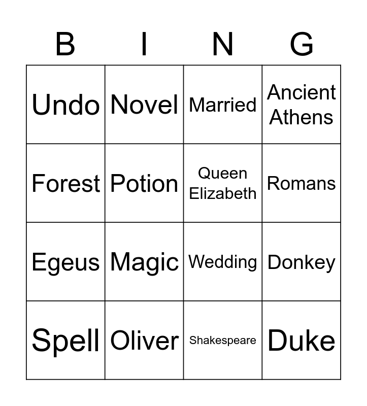 This bingo card has 20 words: Donkey, Fairies, Married, Victorian Era, Spell, Forest, Oliver, Undo, Egeus, Novel, Magic, Wedding, Potion, Duke, Queen Elizabeth, Bottom, Romans, Ancient Athens, Shakespeare and Stage directions.