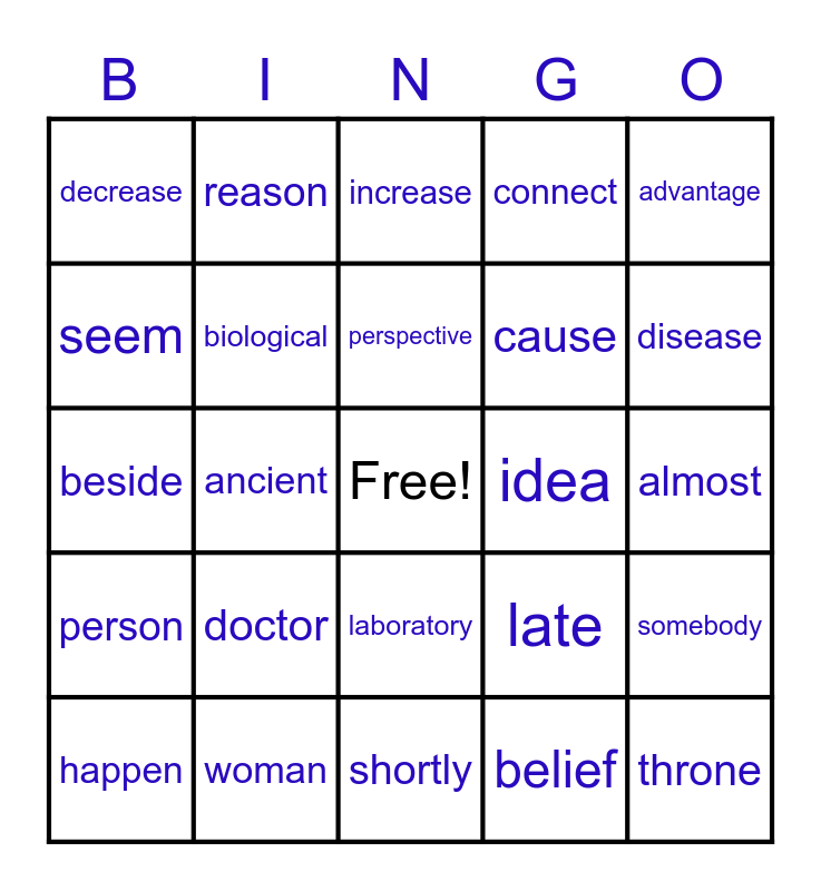 This bingo card has a free space and 76 words: certain, believe, increase, height, example, platform, elegant, uncomfortable, cane, servant, those, class, perspective, seem, control, ancient, raise, throne, subject, advantage, superior, beside, biological, reason, connect, physical, desire, still, powerful, difficult, visual, mental, important, late, disease, cause, out of nowhere, appear, almost, belief, examine, lead, tragedy, birth, deliver, infection, happen, decrease, university, professor, experiment, laboratory, challenge, prevent, spread, bacteria, magic, patient, children, unfortunately, doctor, hospital, death, prove, listen, wash, idea, change, everyone, scientist, somebody, person, woman, sick, shortly and before.