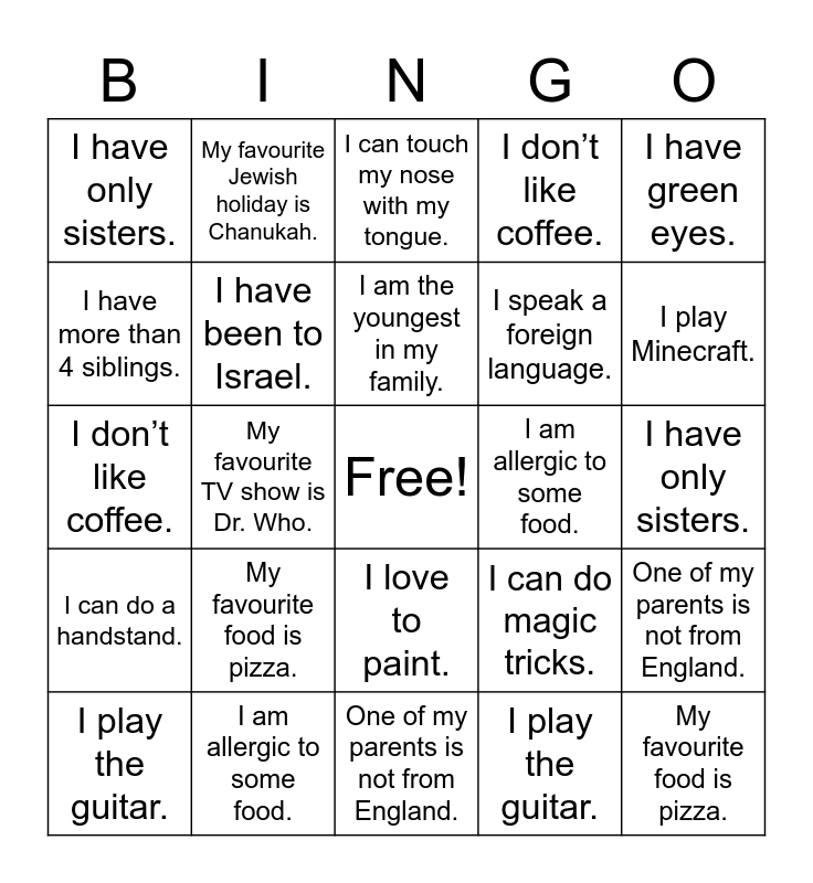 ⚠ This card has duplicate items: I am the youngest in my family. (2), I play the guitar. (2), My favourite colour is green. (2), I have only sisters. (2), One of my parents is not from England. (2), I know how to snowboard. (2), I have been to Israel. (2), My favourite subject is maths. (2), I speak a foreign language. (2), I have more than 4 siblings. (2), I don’t like coffee. (2), I am left-handed. (2), I can do a handstand. (2), I prefer rain to sunshine. (2), I don’t like sweets. (2), My favourite Jewish holiday is Chanukah. (2), I have green eyes. (2), My favourite TV show is Dr. Who. (2), I support Tottenham Hotspurs. (2), My favourite food is pizza. (2), I am allergic to some food. (2), I love baking challah. (2), I can do magic tricks. (2), I can touch my nose with my tongue. (2), I play Minecraft. (2)