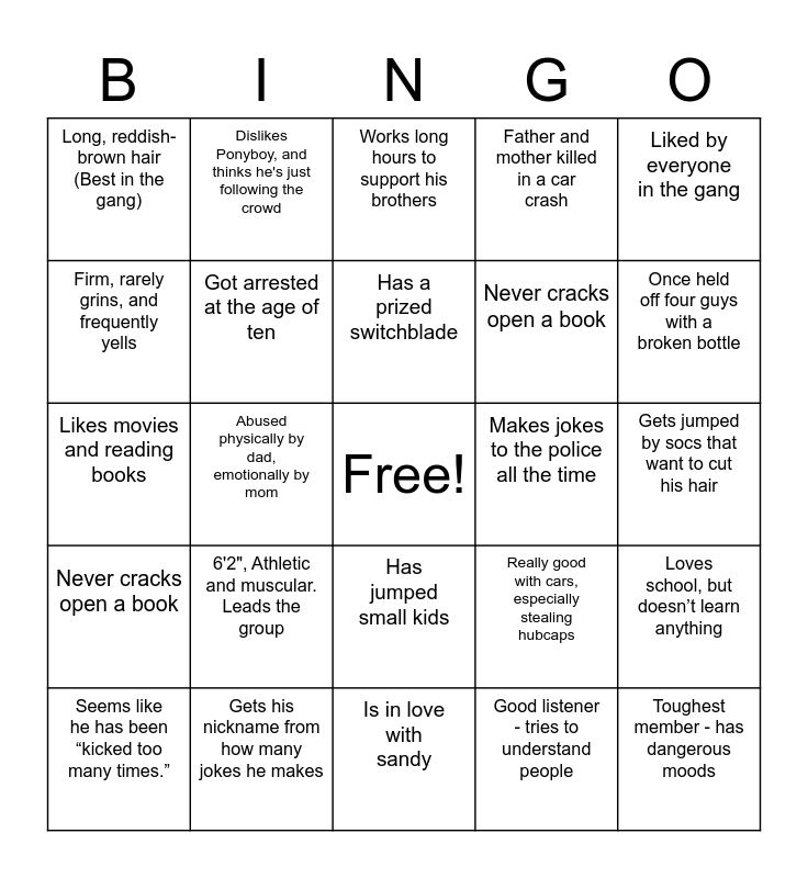 This bingo card has a free space and 24 words: 6'2", Athletic and muscular. Leads the group, Gets his nickname from how many jokes he makes, Has a prized switchblade, Seems like he has been “kicked too many times.”, Liked by everyone in the gang, Long, reddish-brown hair (Best in the gang), Firm, rarely grins, and frequently yells, Dislikes Ponyboy, and thinks he's just following the crowd, Makes jokes to the police all the time, Has jumped small kids, Never cracks open a book, Likes movies and reading books, Really good with cars, especially stealing hubcaps, Loves school, but doesn’t learn anything, Got arrested at the age of ten, Good listener - tries to understand people, Gets jumped by socs that want to cut his hair, Works long hours to support his brothers, Once held off four guys with a broken bottle, Abused physically by dad, emotionally by mom, Toughest member - has dangerous moods, Never cracks open a book, Father and mother killed in a car crash and Is in love with sandy.