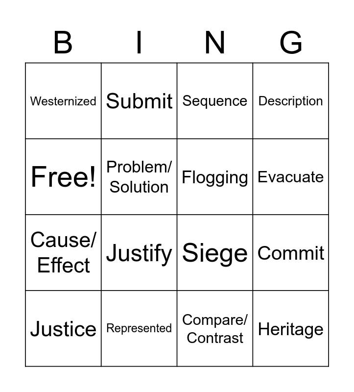 This bingo card has 16 words: Represented, Commit, Sequence, Westernized, Cause/ Effect, Submit, Siege, Compare/ Contrast, Free!, Problem/ Solution, Justice, Description, Justify, Evacuate, Flogging and Heritage.
