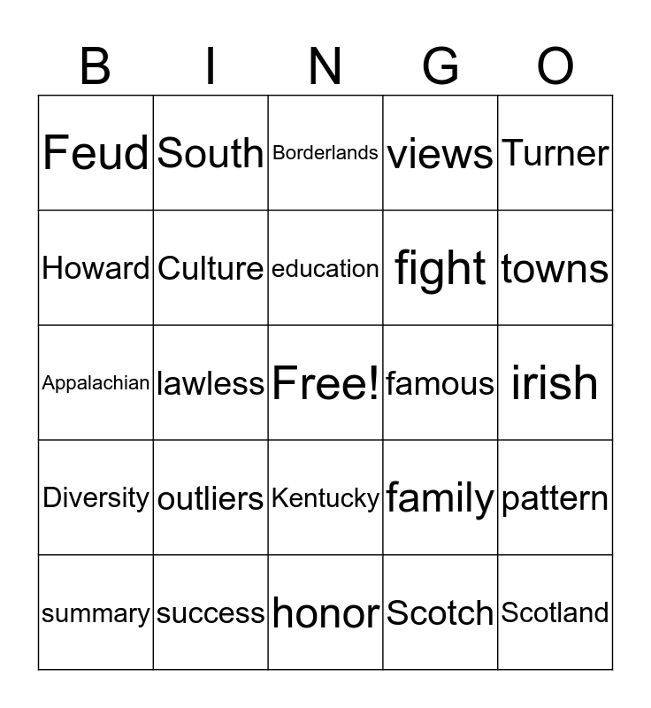 This bingo card has a free space and 24 words: outliers, success, education, summary, Turner, Feud, Howard, South, famous, Kentucky, fight, Appalachian, family, pattern, Culture, Scotch, irish, Borderlands, towns, lawless, Scotland, Diversity, views and honor.