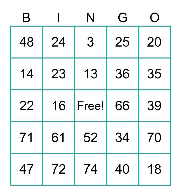 This bingo card has a free space and 75 words: 1, 2, 3, 4, 5, 6, 7, 8, 9, 10, 11, 12, 13, 14, 15, 16, 17, 18, 19, 20, 21, 22, 23, 24, 25, 26, 27, 28, 29, 30, 31, 32, 33, 34, 35, 36, 37, 38, 39, 40, 41, 42, 43, 44, 45, 46, 47, 48, 49, 50, 51, 52, 53, 54, 55, 56, 57, 58, 59, 60, 61, 62, 63, 64, 65, 66, 67, 68, 69, 70, 71, 72, 73, 74 and 75.