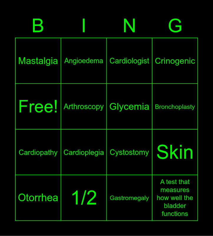 This bingo card has 16 words: 1/2, Skin, Cardiologist, Mastalgia, Cardiopathy, Angioedema, Cystostomy, Gastromegaly, Free!, Arthroscopy, Otorrhea, Crinogenic, Cardioplegia, Bronchoplasty, Glycemia and A test that measures how well the bladder functions.
