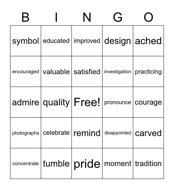 This bingo card has a free space and 34 words: whispered, moment, arrived, inspected, photographs, valuable, ached, concentrate, educated, effort, satisfied, improved, scared, classmate, pronounce, practicing, tumble, admire, celebrate, disappointed, remind, precious, symbol, courage, pride, tradition, design, simple, investigation, encouraged, substitutes, quality, carved and clues.