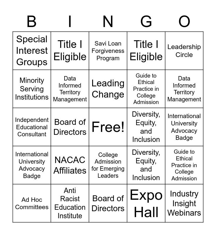 This bingo card has a free space and 42 words: Resilience, Leading Change, Special Interest Groups, NACAC Affiliates, Expo Hall, Guide to Ethical Practice in College Admission, Industry Insight Webinars, NACAC Career Center, Savi Loan Forgiveness Program, College Admission for Emerging Leaders, International University Advocacy Badge, Data Informed Territory Management, Board of Directors, Leadership Circle, Ad Hoc Committees, Diversity, Equity, and Inclusion, Anti Racist Education Institute, Independent Educational Consultant, Admission Professionals, Title I Eligible, Minority Serving Institutions, Resilience, Leading Change, Special Interest Groups, NACAC Affiliates, Expo Hall, Guide to Ethical Practice in College Admission, Industry Insight Webinars, NACAC Career Center, Savi Loan Forgiveness Program, College Admission for Emerging Leaders, International University Advocacy Badge, Data Informed Territory Management, Board of Directors, Leadership Circle, Ad Hoc Committees, Anti Racist Education Institute, Diversity, Equity, and Inclusion, Independent Educational Consultant, Admission Professionals, Title I Eligible and Minority Serving Institutions.