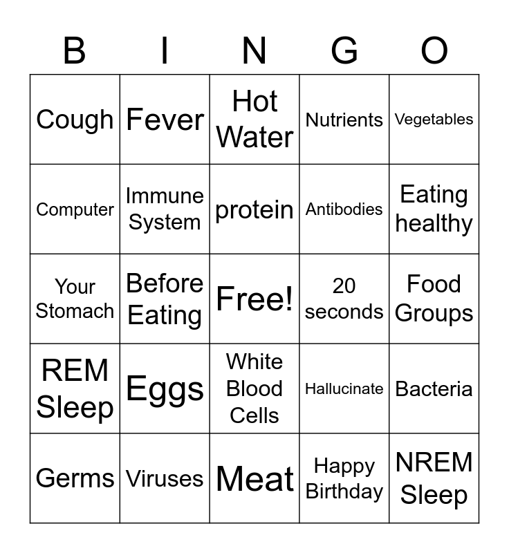 This bingo card has a free space and 35 words: Sleep, Protein, Nutrition, Immune System, White Blood Cells, Nutrients, Computer, dairy, protein, Stranger, Your Stomach, Vegetables, Trusted Adult, Soap, Cough, 20 seconds, Happy Birthday, Before Eating, REM Sleep, NREM Sleep, Hallucinate, Germs, Bacteria, Viruses, Hot Water, Eating healthy, Vaccines, Doctor, Antibodies, Food Groups, Milk, Meat, Eggs, Fever and 8 hours.
