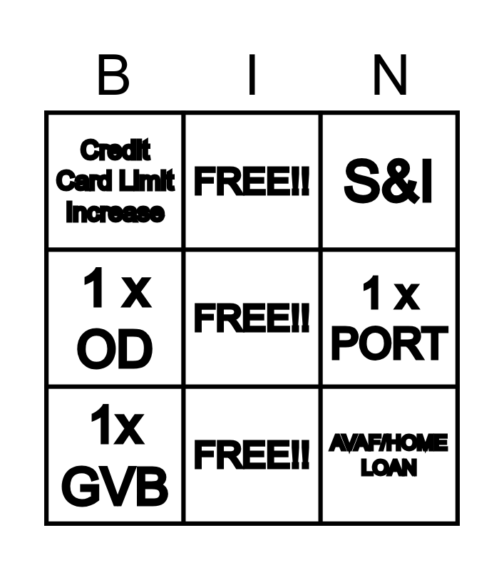 This bingo card has a free space and 8 words: 1 x PORT, S&I, FREE!!, 1x GVB, Credit Card Limit Increase, AVAF/HOME LOAN, 1 x OD and FREE!!.