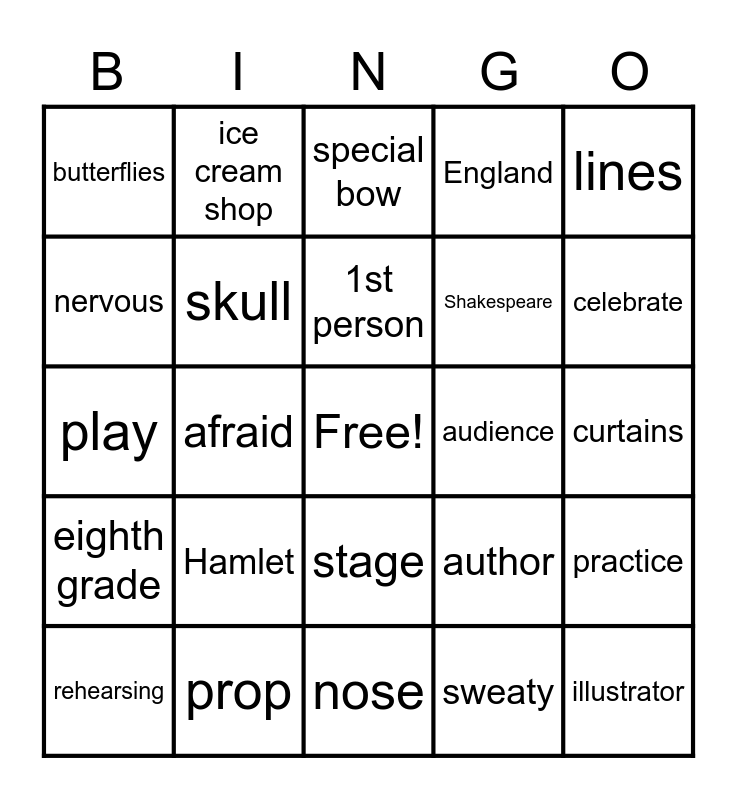 This bingo card has a free space and 24 words: Hamlet, prop, 1st person, rehearsing, lines, butterflies, nervous, ice cream shop, audience, stage, Shakespeare, play, author, practice, skull, sweaty, curtains, special bow, celebrate, afraid, illustrator, eighth grade, England and nose.