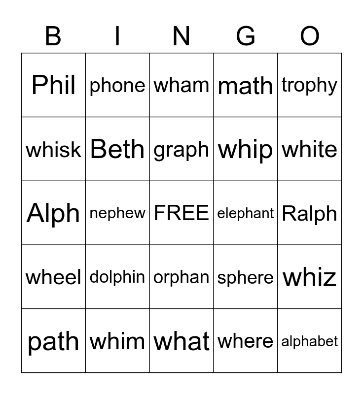 This bingo card has a free space and 24 words: dolphin, whim, graph, path, trophy, Phil, whisk, phone, elephant, orphan, whip, Alph, sphere, whiz, Beth, where, Ralph, wham, white, nephew, alphabet, wheel, math and what.