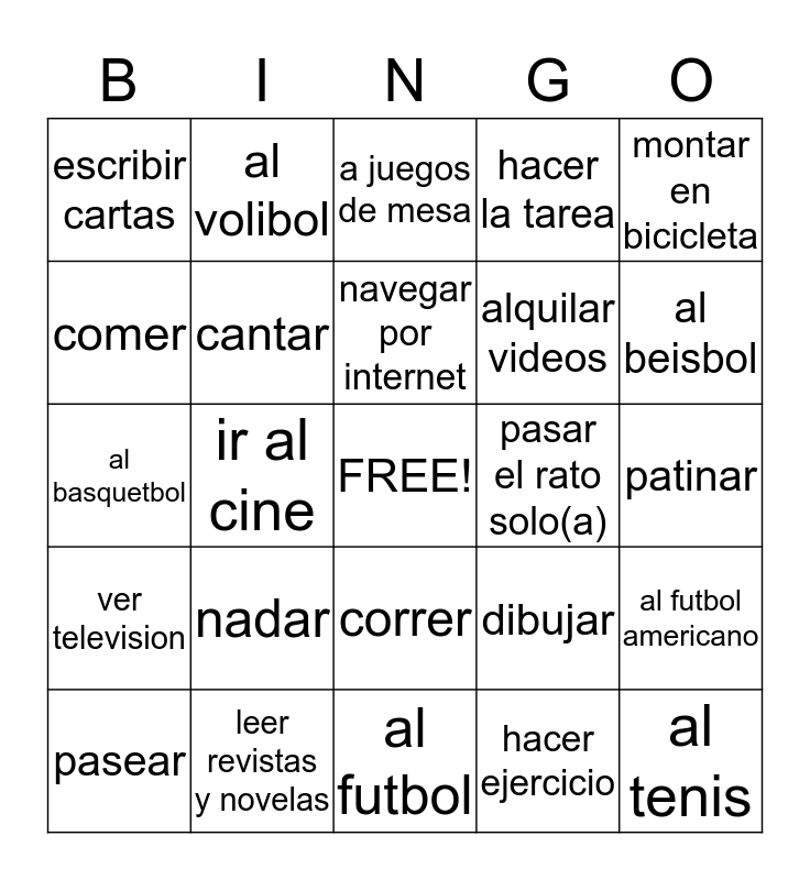 This bingo card has a free space and 24 words: nadar, leer revistas y novelas, navegar por internet, pasear, montar en bicicleta, escribir cartas, comer, al volibol, pasar el rato solo(a), correr, alquilar videos, al basquetbol, dibujar, al futbol americano, cantar, hacer ejercicio, patinar, a juegos de mesa, al beisbol, ir al cine, al tenis, ver television, hacer la tarea and al futbol.