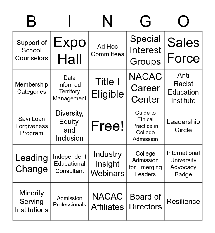 This bingo card has a free space and 24 words: Independent Educational Consultant, Admission Professionals, Title I Eligible, Minority Serving Institutions, Sales Force, Support of School Counselors, Membership Categories, Expo Hall, Guide to Ethical Practice in College Admission, Industry Insight Webinars, NACAC Career Center, Savi Loan Forgiveness Program, College Admission for Emerging Leaders, International University Advocacy Badge, Data Informed Territory Management, Board of Directors, Leadership Circle, Ad Hoc Committees, Anti Racist Education Institute, Diversity, Equity, and Inclusion, Resilience, Leading Change, Special Interest Groups and NACAC Affiliates.