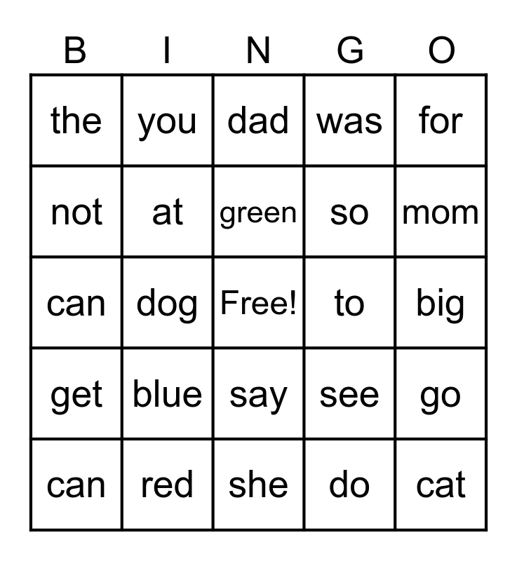 This bingo card has a free space and 24 words: blue, red, green, can, for, the, not, you, to, say, so, can, see, go, at, do, big, dad, mom, dog, cat, get, was and she.