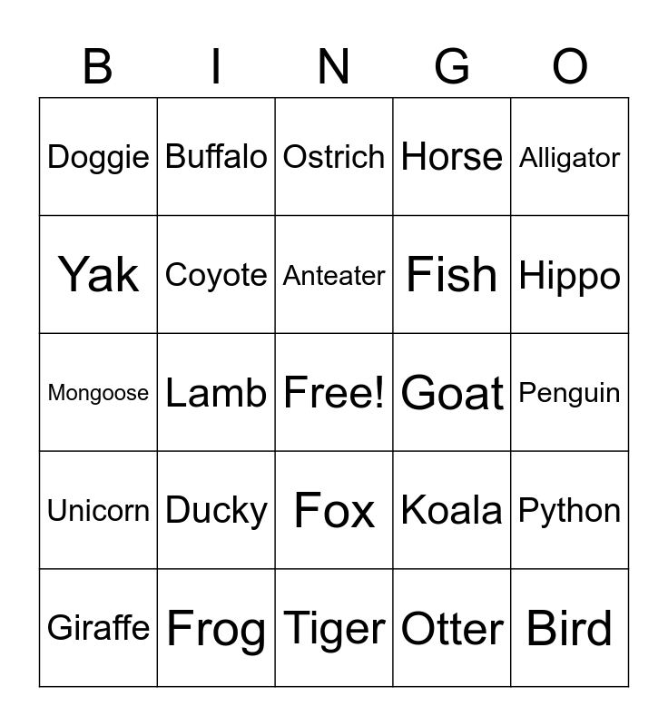 This bingo card has a free space and 24 words: Ducky, Frog, Anteater, Giraffe, Alligator, Doggie, Yak, Buffalo, Goat, Fox, Fish, Mongoose, Koala, Python, Coyote, Otter, Penguin, Ostrich, Hippo, Lamb, Bird, Unicorn, Horse and Tiger.