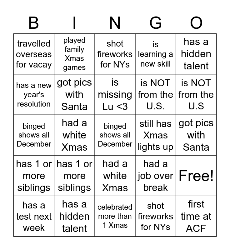 This bingo card has 50 words: has a test next week, binged shows all December, read a new book, celebrated more than 1 Xmas, has 1 or more siblings, is graduating this semester, played family Xmas games, had a real Xmas tree, has a new year's resolution, saw Aubie this week, got pics with Santa, is learning a new skill, Free!, had a job over break, is planning a wedding, got a haircut, is missing Lu <3, still has Xmas lights up, brought a friend tonight, has a hidden talent, had a white Xmas, shot fireworks for NYs, travelled overseas for vacay, is NOT from the U.S., first time at ACF, first time at ACF, is NOT from the U.S, travelled overseas for vacay, shot fireworks for NYs, had a white Xmas, got a haircut, is missing Lu <3, still has Xmas lights up, brought a friend tonight, has a hidden talent, is planning a wedding, had a job over break, Free!, is learning a new skill, got pics with Santa, saw Aubie this week, has a new year's resolution, had a real Xmas tree, is graduating this semester, has a test next week, binged shows all December, read a new book, celebrated more than 1 Xmas, has 1 or more siblings and played family Xmas games.