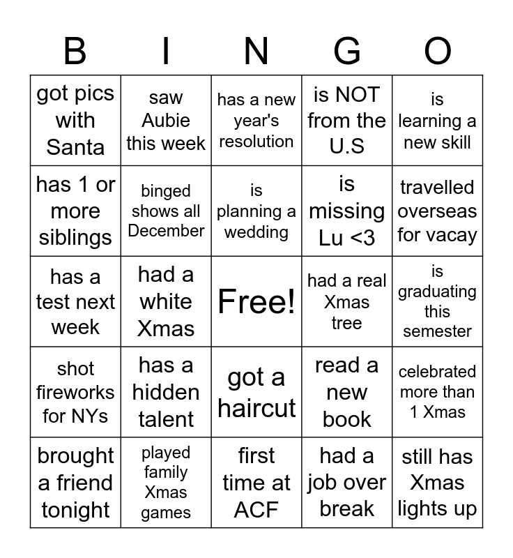 This bingo card has a free space and 24 words: brought a friend tonight, has a hidden talent, is planning a wedding, had a job over break, is learning a new skill, got pics with Santa, saw Aubie this week, has a new year's resolution, had a real Xmas tree, is graduating this semester, has a test next week, binged shows all December, read a new book, celebrated more than 1 Xmas, has 1 or more siblings, played family Xmas games, first time at ACF, is NOT from the U.S, travelled overseas for vacay, shot fireworks for NYs, had a white Xmas, got a haircut, is missing Lu <3 and still has Xmas lights up.