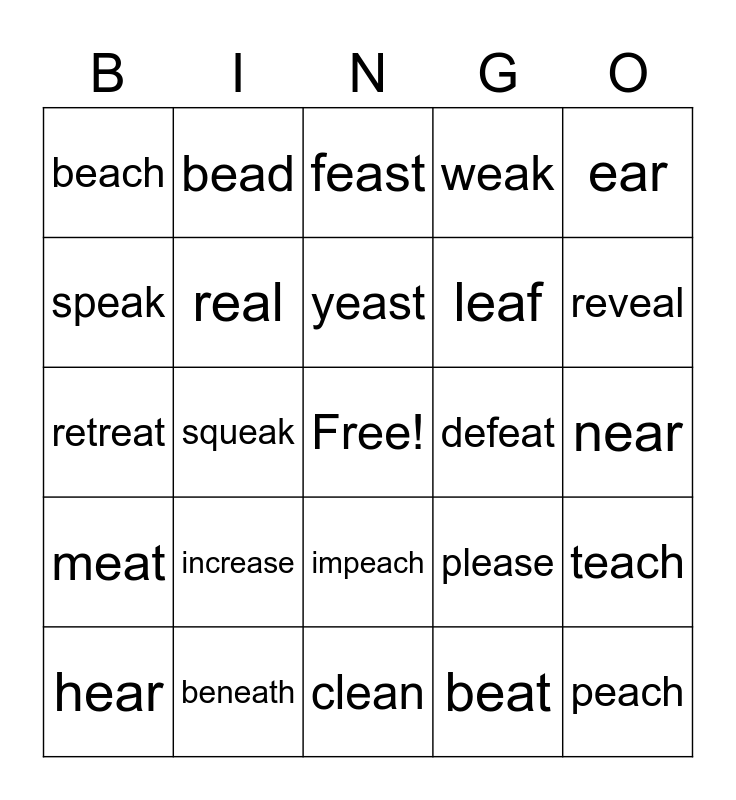 This bingo card has a free space and 34 words: repeat, beat, beast, least, meat, real, ear, hear, bead, read, yeast, feast, stream, cream, defeat, reveal, beneath, retreat, increase, please, impeach, disease, beach, near, clean, peach, weak, dear, leaf, speak, streak, squeak, teach and dream.