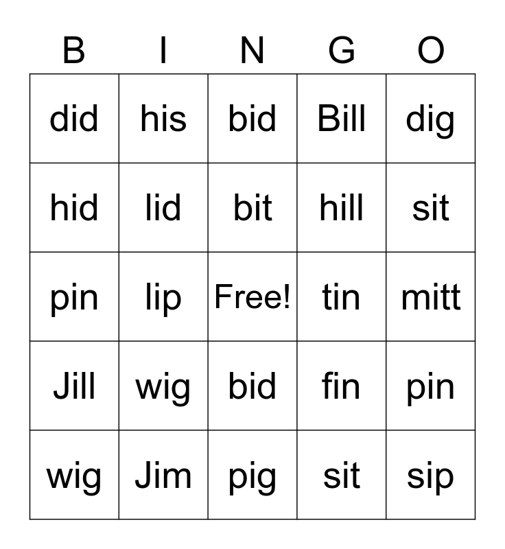This bingo card has a free space and 24 words: wig, Jim, bit, wig, dig, did, hid, his, tin, bid, hill, pin, fin, pin, lid, sit, mitt, bid, sit, lip, sip, Jill, Bill and pig.