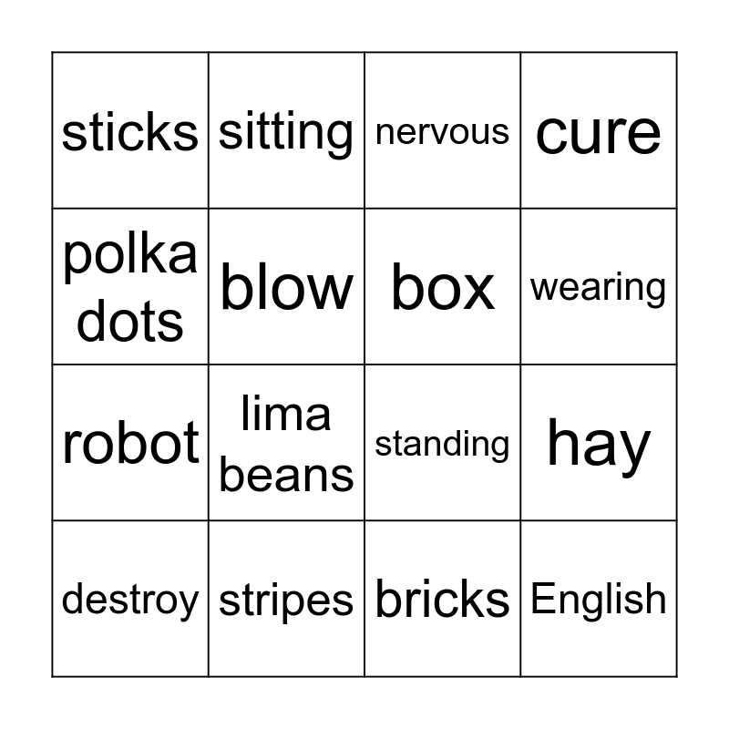 This bingo card has 16 words: stripes, hay, nervous, sticks, robot, sitting, standing, bricks, polka dots, blow, destroy, cure, lima beans, wearing, box and English.