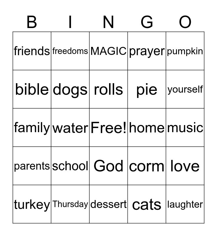 This bingo card has a free space and 24 words: school, Thursday, rolls, turkey, pumpkin, friends, bible, freedoms, home, God, pie, family, corm, love, dogs, cats, music, MAGIC, yourself, water, laughter, parents, prayer and dessert.