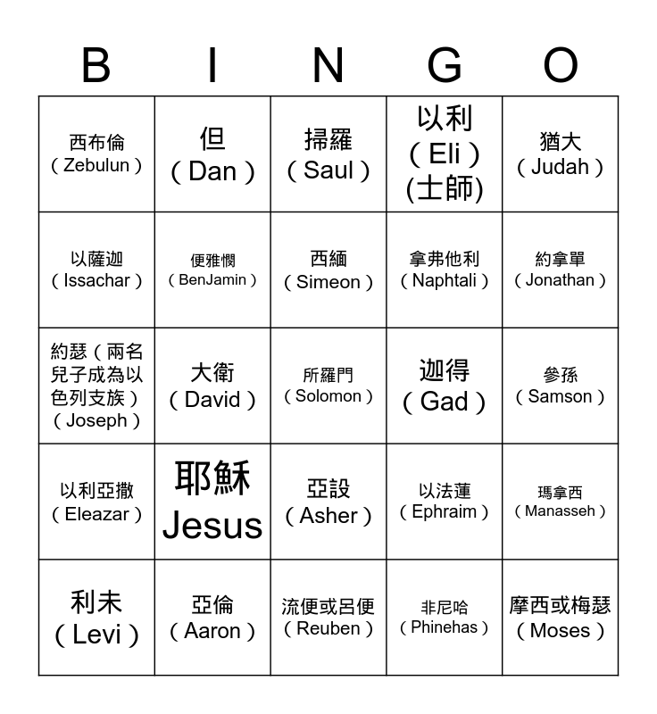 This bingo card has 25 words: 耶穌 Jesus, 流便或呂便(Reuben), 西緬(Simeon), 利未(Levi), 猶大(Judah), 西布倫(Zebulun), 以薩迦(Issachar), 但(Dan), 迦得(Gad), 亞設(Asher), 拿弗他利(Naphtali), 約瑟(兩名兒子成為以色列支族)(Joseph), 以法蓮(Ephraim), 瑪拿西(Manasseh), 便雅憫(BenJamin), 摩西或梅瑟(Moses), 參孫(Samson), 掃羅(Saul), 約拿單(Jonathan), 大衛(David), 所羅門(Solomon), 亞倫(Aaron), 以利亞撒(Eleazar), 以利(Eli)(士師) and 非尼哈(Phinehas).