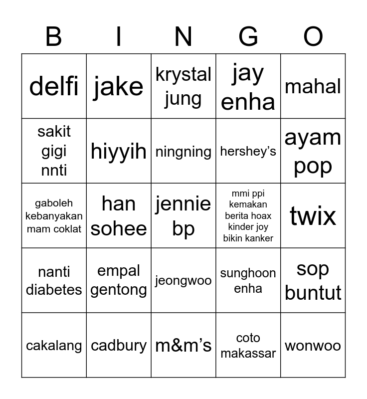 This bingo card has a free space and 24 words: empal gentong, cadbury, ningning, cakalang, mahal, delfi, sakit gigi nnti, jake, mmi ppi kemakan berita hoax kinder joy bikin kanker, jeongwoo, hershey’s, gaboleh kebanyakan mam coklat, sunghoon enha, sop buntut, hiyyih, coto makassar, twix, krystal jung, ayam pop, han sohee, wonwoo, nanti diabetes, jay enha and m&m’s.