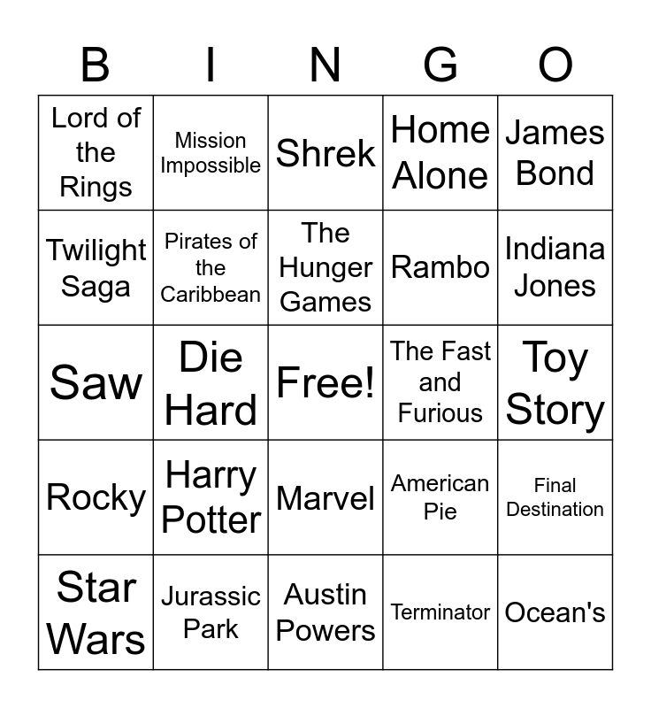 This bingo card has a free space and 24 words: Harry Potter, Jurassic Park, The Hunger Games, Star Wars, James Bond, Lord of the Rings, Twilight Saga, Mission Impossible, The Fast and Furious, Marvel, Rambo, Saw, American Pie, Final Destination, Pirates of the Caribbean, Terminator, Toy Story, Shrek, Indiana Jones, Die Hard, Ocean's, Rocky, Home Alone and Austin Powers.