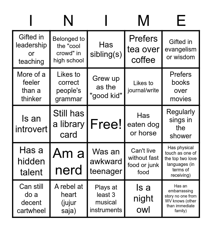 This bingo card has a free space and 34 words: Was born outside the US, Is a night owl, Can comfortably go up to anyone and start a conversation, Has stepped foot on at least 5 continents, Has a hidden talent, Likes to correct people's grammar, Gifted in evangelism or wisdom, Can still do a decent cartwheel, Belonged to the "cool crowd" in high school, Can pronounce "ngomong2" correctly, Grew up as the "good kid", Has sibling(s), Talks during movies, Is a verbal processor, Has eaten dog or horse, Prefers books over movies, A rebel at heart (jujur saja), Is an introvert, Am a nerd, Can't live without fast food or junk food, Was an awkward teenager, Has lived in at least 5 cities, Gifted in leadership or teaching, Regularly sings in the shower, Plays at least 3 musical instruments, Has an embarrassing story no one from WV knows (other than immediate family), Prefers tea over coffee, Can go without my phone for at least 24 hours, Likes to journal/write, More of a feeler than a thinker, Plans vacation itineraries based on food or cultural/historical sites, Still has a library card, Has physical touch as one of the top two love languages (in terms of receiving) and Enjoys team building activities.