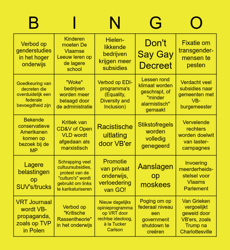 This bingo card has a free space and 24 words: VRT Journaal wordt VB-propaganda, zoals op TVP in Polen, Schrapping veel cultuursubsidies, protest van de "culturo's" wordt gebruikt om links te karikaturiseren, Verbod op EDI-programma's (Equality, Diversity and Inclusion), Poging om op federaal niveau een government shutdown te creëren, Fixatie om transgender- mensen te pesten, Verbod op genderstudies in het hoger onderwijs, Kinderen moeten De Vlaamse Leeuw leren op de lagere school, Hielen-likkende bedrijven krijgen meer subsidies, Stikstofregels worden volledig genegeerd, Vervelende rechters worden doelwit van laster-campagnes, Bekende conservatieve Amerikanen komen op bezoek bij de MP, "Woke" bedrijven worden meer belaagd door de administratie, Aanslagen op moskees, Invoering meerderheids-stelsel voor Vlaams Parlement, Goedkeuring van decreten die overduidelijk een federale bevoegdheid zijn, Verbod op "Kritische Rassentheorie" in het onderwijs, Nieuw dagelijks opinieprogramma op VRT door rechtse ideoloog, à la Tucker Carlson, Don't Say Gay Decreet, Verdacht veel subsidies naar gemeenten met VB-burgemeester, Lagere belastingen op SUV's/trucks, Kritiek van CD&V of Open VLD wordt afgedaan als marxistisch, Promotie van privaat onderwijs, verloedering van GO!, Lessen rond klimaat worden geschrapt, of "minder alarmistisch" gemaakt and Van Grieken vergoelijkt geweld door VB'ers, zoals Trump na Charlottesville.