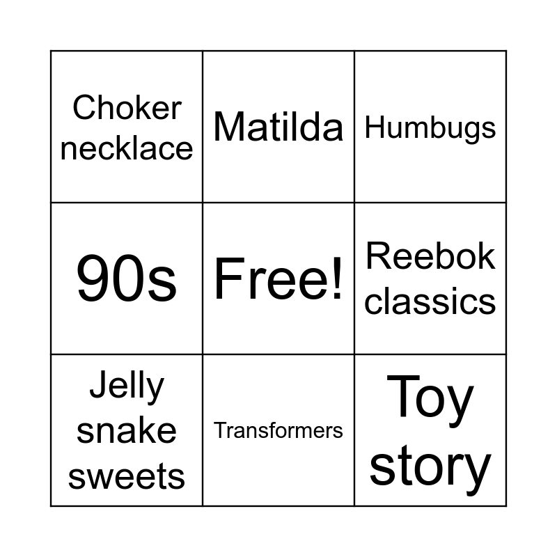 This bingo card has a free space and 11 words: Space invaders, Transformers, Toy story, Jelly snake sweets, Matilda, Humbugs, Reebok classics, Denim, 90s, Choker necklace and Bucket hat.