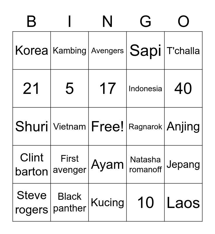 This bingo card has a free space and 25 words: First avenger, Kucing, 17, Steve rogers, T'challa, Korea, 21, Kambing, Ragnarok, Ayam, Indonesia, Shuri, Natasha romanoff, Jepang, 5, Captain marvel, Anjing, Avengers, 40, Vietnam, Laos, Black panther, Clint barton, Sapi and 10.