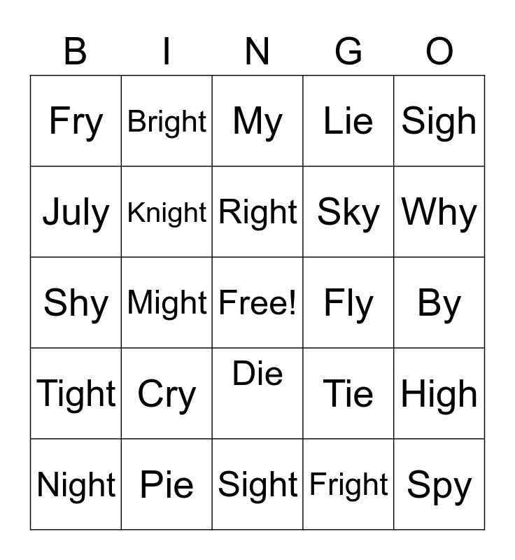 This bingo card has a free space and 24 words: Cry, Pie, Right, Night, Sigh, Fry, July, Bright, Fly, Die, Sky, Shy, Tie, High, Knight, Fright, By, My, Why, Might, Spy, Tight, Lie and Sight.