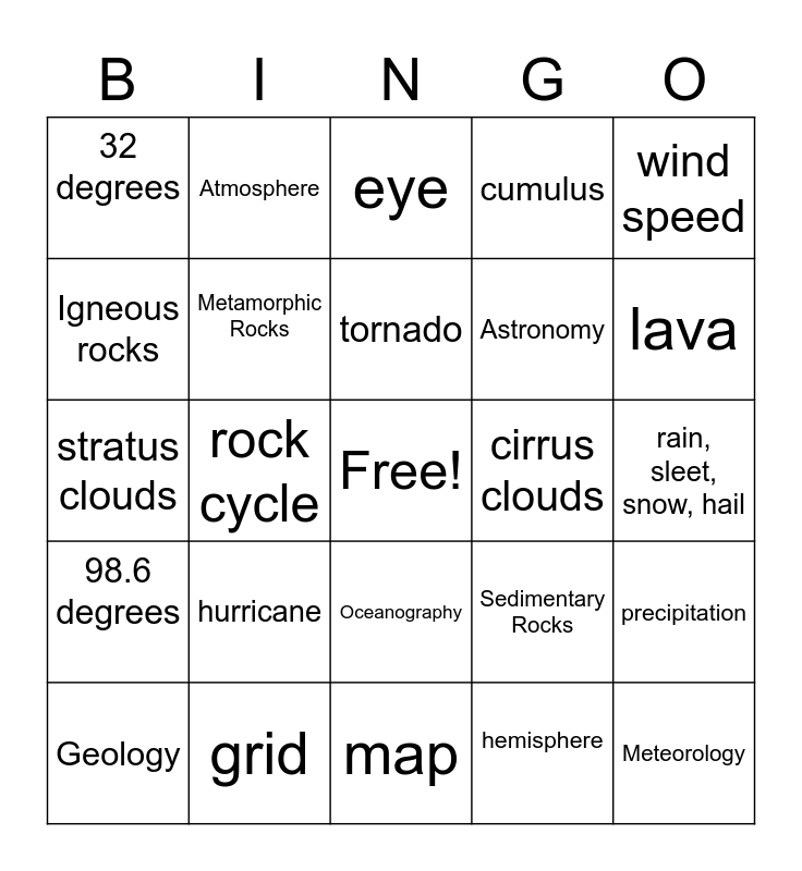 This bingo card has a free space and 24 words: hurricane, grid, tornado, Geology, wind speed, 32 degrees, Igneous rocks, Atmosphere, cirrus clouds, Oceanography, Astronomy, stratus clouds, Sedimentary Rocks, precipitation, Metamorphic Rocks, hemisphere, rain, sleet, snow, hail, eye, lava, rock cycle, Meteorology, 98.6 degrees, cumulus and map.