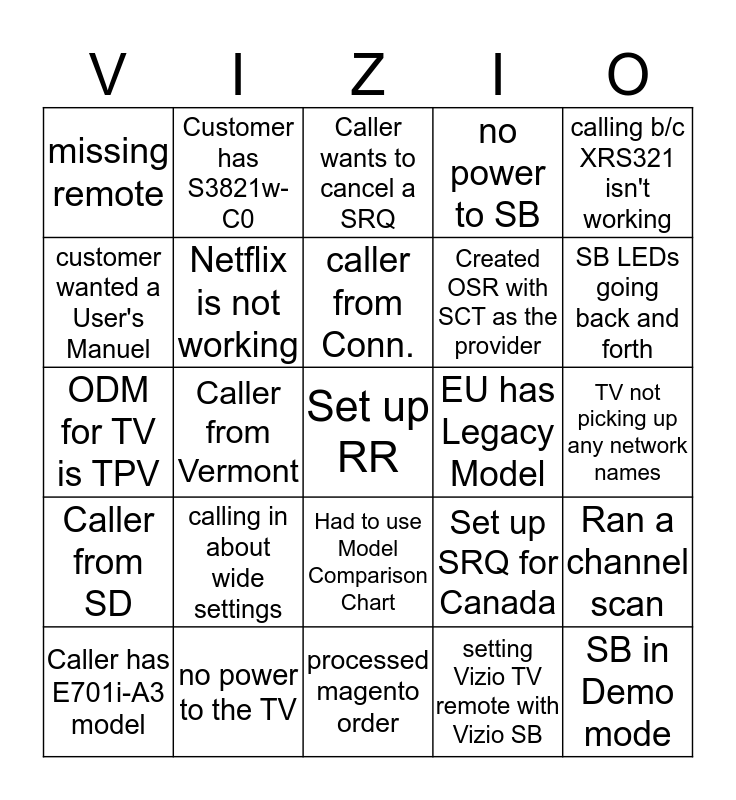 This bingo card has a free space and 24 words: calling in about wide settings, no power to the TV, caller from Conn., Caller has E701i-A3 model, calling b/c XRS321 isn't working, missing remote, customer wanted a User's Manuel, Customer has S3821w-C0, EU has Legacy Model, Had to use Model Comparison Chart, Created OSR with SCT as the provider, ODM for TV is TPV, Set up SRQ for Canada, Ran a channel scan, Netflix is not working, setting Vizio TV remote with Vizio SB, TV not picking up any network names, Caller wants to cancel a SRQ, SB LEDs going back and forth, Caller from Vermont, SB in Demo mode, Caller from SD, no power to SB and processed magento order.