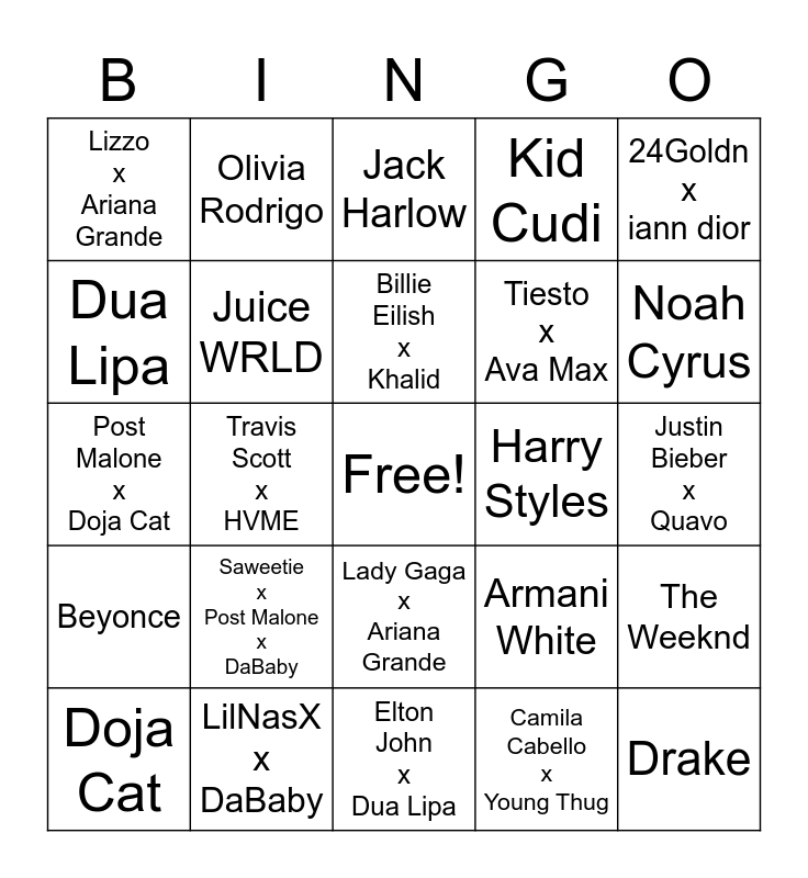 This bingo card has a free space and 24 words: Saweetie x Post Malone x DaBaby, LilNasX x DaBaby, Billie Eilish x Khalid, Doja Cat, 24Goldn x iann dior, Lizzo x Ariana Grande, Dua Lipa, Olivia Rodrigo, Harry Styles, Lady Gaga x Ariana Grande, Tiesto x Ava Max, Post Malone x Doja Cat, Armani White, The Weeknd, Juice WRLD, Camila Cabello x Young Thug, Justin Bieber x Quavo, Jack Harlow, Noah Cyrus, Travis Scott x HVME, Drake, Beyonce, Kid Cudi and Elton John x Dua Lipa.