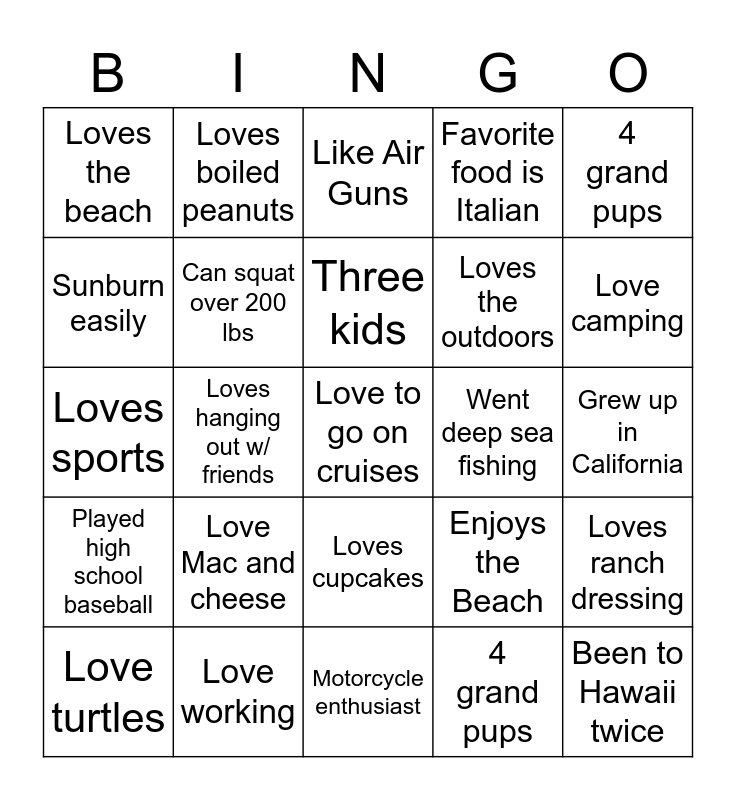 ⚠ This card has duplicate items: Dislikes Cold Weather (2), Enjoys the Beach (2), 4 grand pups (2), Loves to Read (2), NRA certified (2), Debt Free (2), Love to learn (2), Love to watch movies (2), Three dogs (2), Three kids (2), Married to middle school BF (2), Love to craft (2), From Indiana (2), Played high school baseball (2), Youngest paramedic (2), Sunburn easily (2), Like Air Guns (2), Loves the beach (2), Loves all kind of music (2), Been to Hawaii twice (2), Loves cupcakes (2), Love working (2), Cannot draw (2), Love scrapbooking (2), Like hiking in the mountains (2), Love Mac and cheese (2), Love camping (2), Favorite food is Italian (2), Love going to concerts (2)