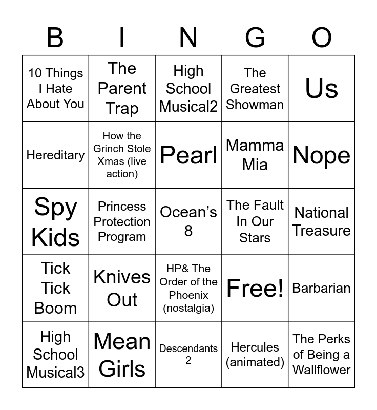 This bingo card has 25 words: Knives Out, Descendants 2, Pearl, High School Musical3, Us, 10 Things I Hate About You, Hereditary, The Parent Trap, The Fault In Our Stars, HP& The Order of the Phoenix (nostalgia), Mamma Mia, Spy Kids, Free!, Barbarian, How the Grinch Stole Xmas (live action), The Perks of Being a Wallflower, National Treasure, High School Musical2, Nope, Princess Protection Program, Ocean’s 8, Mean Girls, Tick Tick Boom, The Greatest Showman and Hercules (animated).