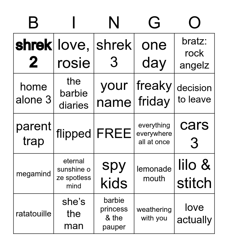 This bingo card has a free space and 24 words: eternal sunshine o ze spotless mind, she’s the man, your name, ratatouille, bratz: rock angelz, shrek 2, home alone 3, love, rosie, everything everywhere all at once, spy kids, freaky friday, parent trap, lemonade mouth, lilo & stitch, the barbie diaries, weathering with you, cars 3, shrek 3, decision to leave, flipped, love actually, megamind, one day and barbie princess & the pauper.