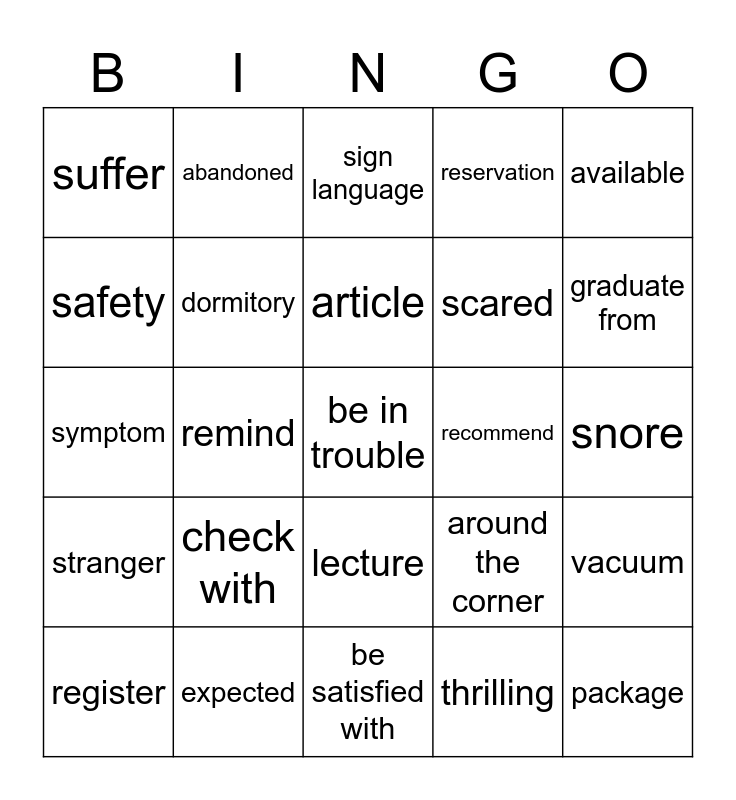 This bingo card has a free space and 24 words: check with, expected, article, register, available, suffer, safety, abandoned, recommend, lecture, scared, symptom, around the corner, vacuum, dormitory, thrilling, snore, sign language, graduate from, remind, package, stranger, reservation and be satisfied with.