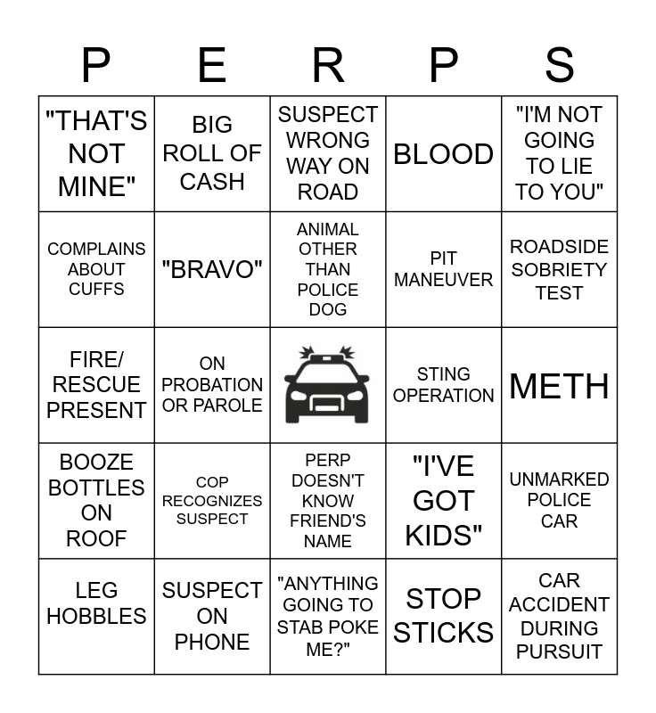This bingo card has a free space and 28 words: UNMARKED POLICE CAR, AMBULANCE NEEDED, PIT MANEUVER, STOP STICKS, COMPLAINS ABOUT CUFFS, SUSPECT WRONG WAY ON ROAD, BIG ROLL OF CASH, BOOZE BOTTLES ON ROOF, STING OPERATION, LEG HOBBLES, FIRE/ RESCUE PRESENT, BLOOD, SUSPECT ON PHONE, "ANYTHING GOING TO STAB POKE ME?", ROADSIDE SOBRIETY TEST, CAR RAN STOP SIGN, COP RECOGNIZES SUSPECT, "BRAVO", ANIMAL OTHER THAN POLICE DOG, PERP DOESN'T KNOW FRIEND'S NAME, "THAT'S NOT MINE", "STOP RESISTING", CAR ACCIDENT DURING PURSUIT, ON PROBATION OR PAROLE, METH, "I'VE GOT KIDS", "I'M NOT GOING TO LIE TO YOU" and TOSSES DRUGS.
