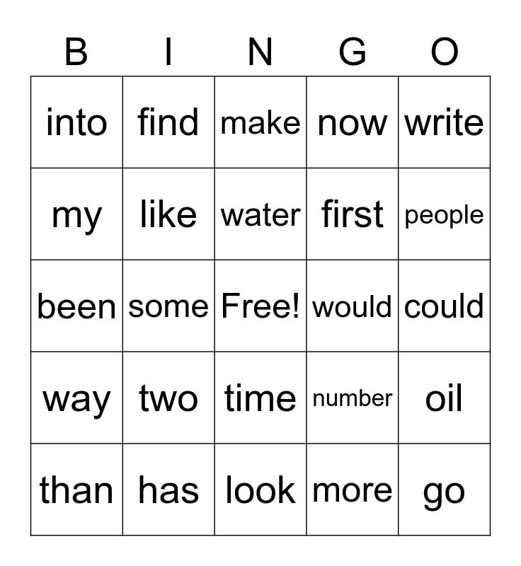This bingo card has a free space and 30 words: has, her, some, him, into, make, like, time, would, look, could, go, more, no, people, see, number, way, two, write, been, call, find, first, my, now, oil, than, water and who.