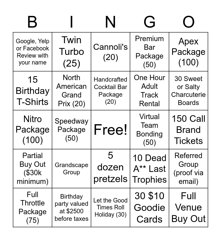 This bingo card has a free space and 24 words: Grandscape Group, Birthday party valued at $2500 before taxes, Handcrafted Cocktail Bar Package (20), Full Throttle Package (75), Apex Package (100), Google, Yelp or Facebook Review with your name, 15 Birthday T-Shirts, Twin Turbo (25), Virtual Team Bonding (50), 5 dozen pretzels, One Hour Adult Track Rental, Nitro Package (100), 10 Dead A** Last Trophies, Referred Group (proof via email), North American Grand Prix (20), 30 $10 Goodie Cards, 150 Call Brand Tickets, Cannoli's (20), 30 Sweet or Salty Charcuterie Boards, Speedway Package (50), Full Venue Buy Out, Partial Buy Out ($30k minimum), Premium Bar Package (50) and Let the Good Times Roll Holiday (30).