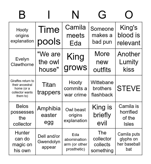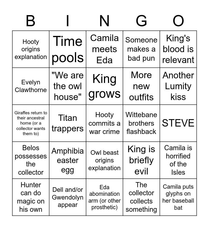 This bingo card has 34 words: Camila puts glyphs on her baseball bat, The collector collects something, Huntlow, collector's parents, Belos possesses the collector, "We are the owl house", King's blood is relevant, Hunter can do magic on his own, Time pools, Harpy Lilith, King grows, Camila meets Eda, Snake palisman (Free Space), Collector redemption arc, Wittebane brothers flashback, Another Lumity kiss, Dell and/or Gwendolyn appear, Giraffes return to their ancestral home (or a collector wants them to), Amphibia easter egg, King is briefly evil, Owl beast origins explanation, Gravity Falls Easter Egg, Hooty origins explanation, STEVE, Eda abomination arm (or other prosthetic), Hooty commits a war crime, Someone makes a bad pun, Eda resists the collector's control, More new outfits, Evelyn Clawthorne, Bat Queen returns, Titan trappers, Camila is horrified of the Isles and Camila fits right in in the Isles.