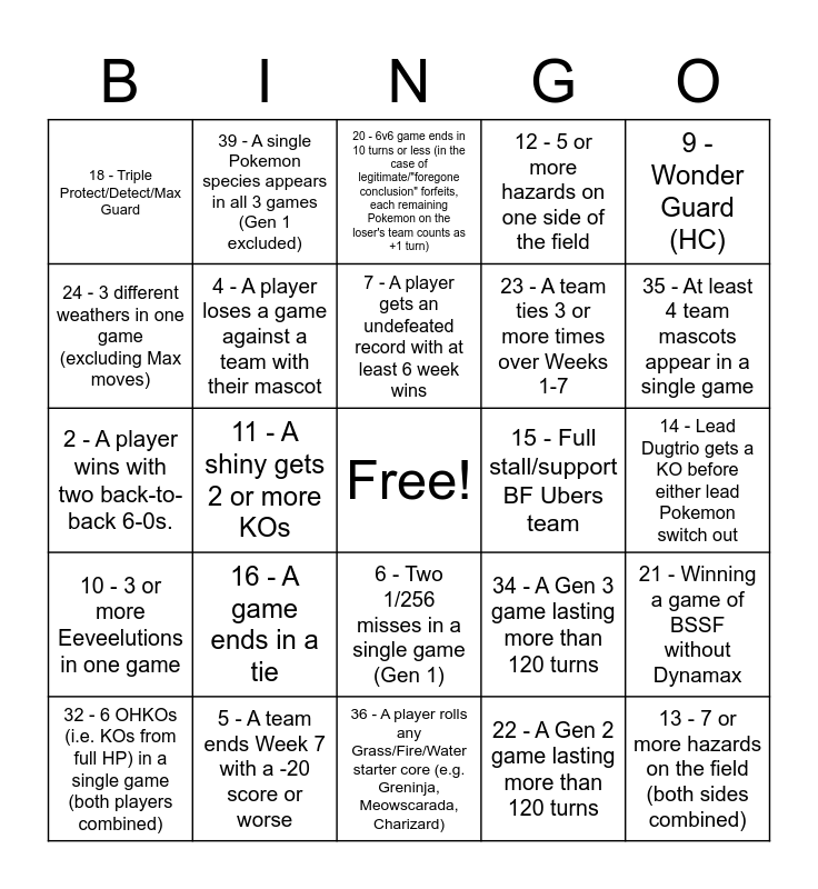 This bingo card has a free space and 40 words: 1 - Series decided by EOD Monday, 2 - A player wins with two back-to-back 6-0s., 3 - A player wins a game with their mascot on their team, 4 - A player loses a game against a team with their mascot, 5 - A team ends Week 7 with a -20 score or worse, 6 - Two 1/256 misses in a single game (Gen 1), 7 - A player gets an undefeated record with at least 6 week wins, 8 - A player intentionally uses a Ground-type attack on Gengar. (Gens 3-6 only. Switching in with Gengar on a predicted Ground-type attack doesn't count.), 9 - Wonder Guard (HC), 10 - 3 or more Eeveelutions in one game, 11 - A shiny gets 2 or more KOs, 12 - 5 or more hazards on one side of the field, 13 - 7 or more hazards on the field (both sides combined), 14 - Lead Dugtrio gets a KO before either lead Pokemon switch out, 15 - Full stall/support BF Ubers team, 16 - A game ends in a tie, 17 - 12-0 series, 18 - Triple Protect/Detect/Max Guard, 19 - Unown gets a KO, 20 - 6v6 game ends in 10 turns or less (in the case of legitimate/"foregone conclusion" forfeits, each remaining Pokemon on the loser's team counts as +1 turn), 21 - Winning a game of BSSF without Dynamax, 22 - A Gen 2 game lasting more than 120 turns, 23 - A team ties 3 or more times over Weeks 1-7, 24 - 3 different weathers in one game (excluding Max moves), 25 - Timer loss, 26 - Zoroark above level 90, 27 - One side rolls hazards, the other rolls hazard removal (HC), 28 - 6 or more correct Sucker Punch predictions in a single game, 29 - Both team mascots (those of the players, not other teams') appear in a single game, 30 - HC team with 2 Pokemon of the same evolution line, 31 - 2 KOs from OHKO moves (e.g. Fissure) in a single game, 32 - 6 OHKOs (i.e. KOs from full HP) in a single game (both players combined), 33 - 4 KOs under Trick Room in a single game, 34 - A Gen 3 game lasting more than 120 turns, 35 - At least 4 team mascots appear in a single game, 36 - A player rolls any Grass/Fire/Water starter core (e.g. Greninja, Meowscarada, Charizard), 37 - A player rolls an HC team of only final-stage Pokemon (HC), 38 - A Pokemon Terastallizes and faints in the same turn, 39 - A single Pokemon species appears in all 3 games (Gen 1 excluded) and 40 - 3 or more Paradox Pokemon appear on a single team.